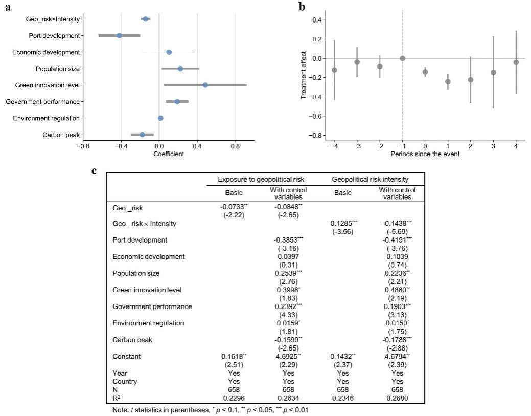 Figure 2 presents the empirical regression and parallel trend test results. Further stagewise regression analysis revealed that the negative impact intensifies over time. Although the IMO’s strengthened climate policies since 2018 partially mitigate this effect, their influence remains limited.