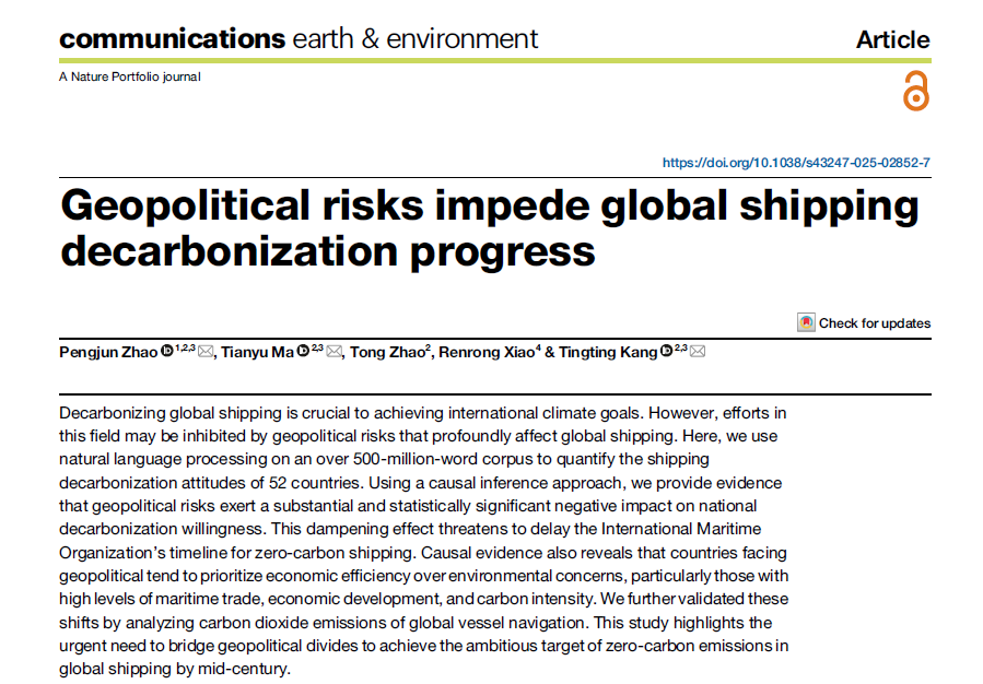 A research team led by Professor Pengjun Zhao from Peking University, supported by the National Science Fund for Distinguished Young Scholars and related projects, employed natural language processing (NLP) to quantify the attitudes of 52 countries toward shipping decarbonization from 2010 to 2024. Using causal inference methods, the study revealed that geopolitical risks have a significant negative impact on national willingness to decarbonize shipping, potentially delaying the IMO’s net-zero shipping target by up to 50 years.