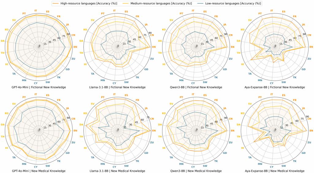 Effectiveness inequality (Figure 2) refers to significant disparities in learning efficiency and final accuracy across languages. Under identical learning settings, LLMs tend to converge faster and achieve higher performance in high-resource languages, while learning in low-resource languages is slower and capped at lower performance levels. This indicates that new knowledge is not absorbed in a language-neutral manner, placing low-resource language users at a persistent disadvantage in accessing up-to-date information.