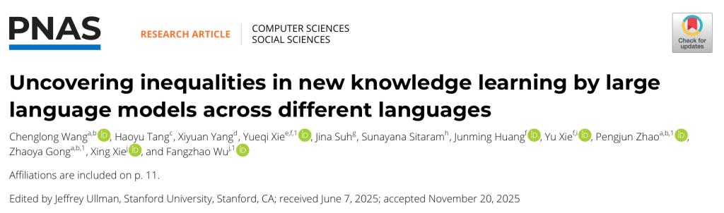 The study, titled “Uncovering inequalities in new knowledge learning by large language models across different languages,” was published online in Proceedings of the National Academy of Sciences (PNAS) on December 19, 2025.