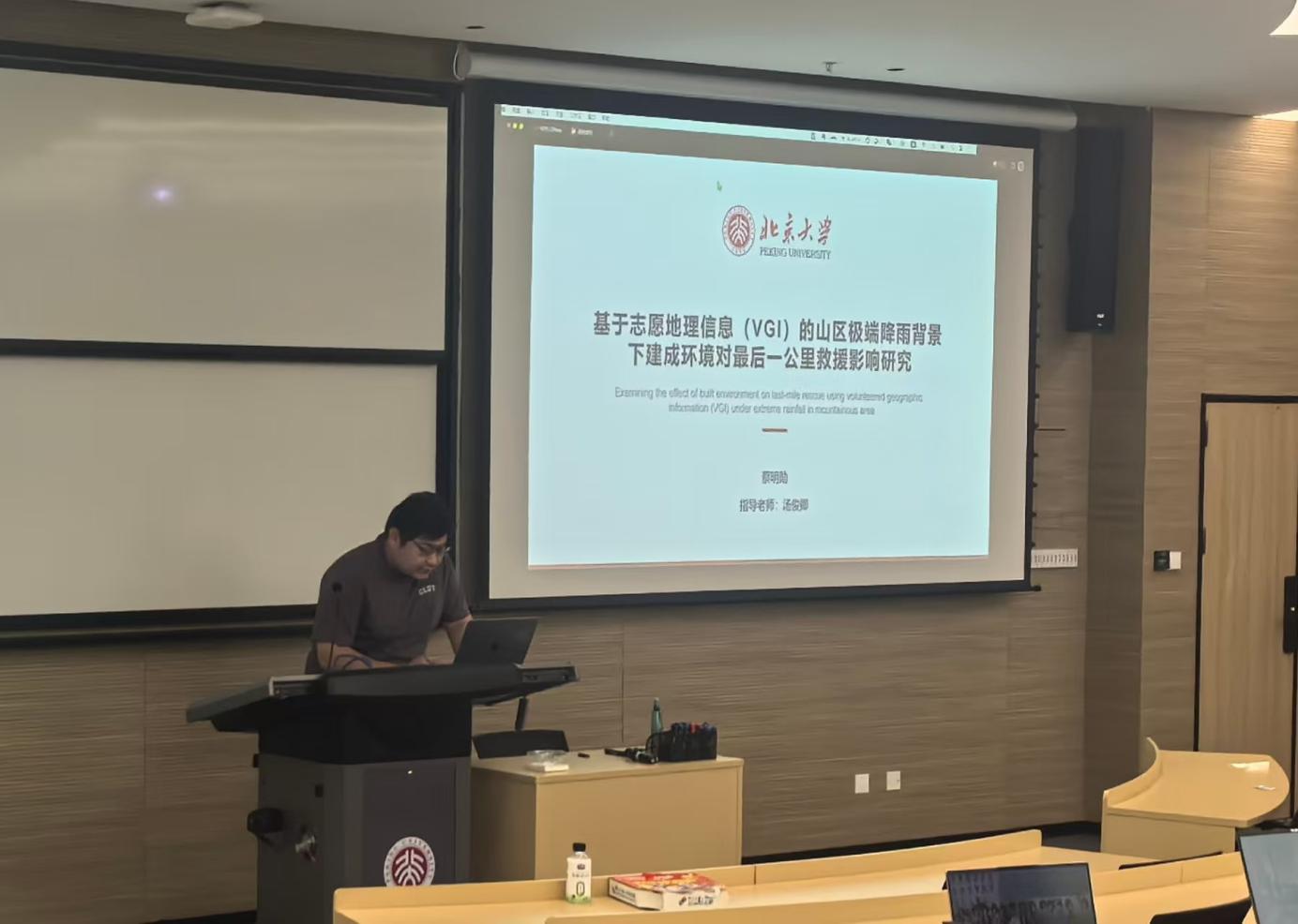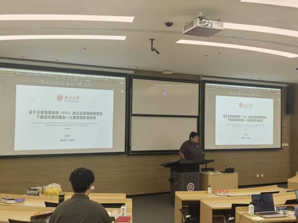 蔡明勋同学汇报的题目是“基于志愿地理信息(VGI)的山区极端降雨背景下建成环境对最后一公里救援影响研究”。山区极端降雨背景下 “最后一公里” 救援效率是保障受灾群众生命安全的关键,然而现有研究多聚焦技术优化或宏观损失评估,缺乏人本视角下救援需求识别与建成环境多尺度影响机制的系统分析,难以支撑山区应急救援精细化管理。为填补这一空白,本研究以北京西山山区 “7・31” 极端降雨事件为案例,利用腾讯志愿地理信息(VGI)数据、高德路网与 POI 数据及北京市地质图等,通过 BERT 模型识别受灾群众情绪、GPT-4 提取救援需求与灾害影响,划分及时 / 延时 / 未获救援三类效率类型,结合 XGBoost 模型与 SHAP 解释模块,在 0.5 公里、1 公里、2 公里尺度下分析建成环境因子对救援效率的影响。研究将揭示不同救援效率下建成环境的差异特征及关键影响因子作用机制,为山区极端降雨应急救援的空间优化与响应策略制定提供科学依据。
