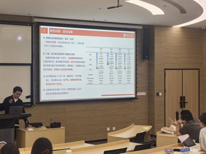 张东同学汇报的题目是“城市更新对商业绅士化的动态影响”。城市更新是推动城市结构优化与品质提升的关键举措,商业绅士化作为更新过程中商业业态转型的核心议题,其动态演变规律对平衡城市发展与民生保障至关重要,然而现有研究多忽视商业绅士化的阶段性特征,且对更新各阶段影响差异及周边区域溢出效应的量化分析相对粗糙,难以支撑城市更新的精细化管理需求。本研究以深圳市为案例,利用 748 个城市更新项目数据(划分为项目立项、项目公告、项目实施主体确认、项目完成四个阶段)、2019-2023年 大众点评 POI 数据,结合缓冲区分析技术建立涵盖高端商业数量、占比、丰富度、质量的商业绅士化特征数据库,并依托消费-生产二元理论框架,评估深圳城市更新不同阶段对商业绅士化的动态作用,分析 1km 范围内周边区域的溢出影响及关内关外区域的异质性差异,为优化城市更新政策、协调高端商业发展与原有业态保护提供依据。