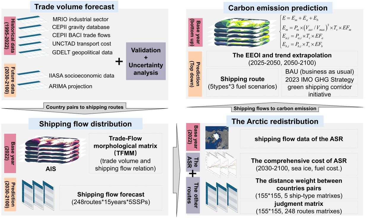 北京大学赵鹏军团队依托国家杰出青年科学基金及其延续资助项目等,构建了贸易—航运—排放一体化模拟预测 (TISEP)模型框架(图1),基于6.49亿条AIS船舶定位数据、多源贸易大数据和北极海洋气象数据等,高精度模拟了气候变化、北极冰情、全球贸易、船舶航行路线、船舶碳排放等不同维度、不同时空尺度的复杂地球—人类系统交互过程,发现了北极航道开通的特征及其对全球航运格局和全球航运碳排的影响,提出并模拟了北极航道的减碳策略。