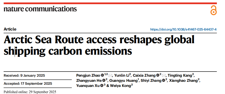 该研究成果以 “Arctic Sea Route reshapes global shipping carbon emissions” 为题,于 2025 年9月29日在线发表在 Nature Communications 期刊上。北京大学赵鹏军教授为论文第一作者和通讯作者,张彩霞副研究员为论文共同通讯作者。该研究得到国家自然科学基金(42525101, 42130402)等资助。