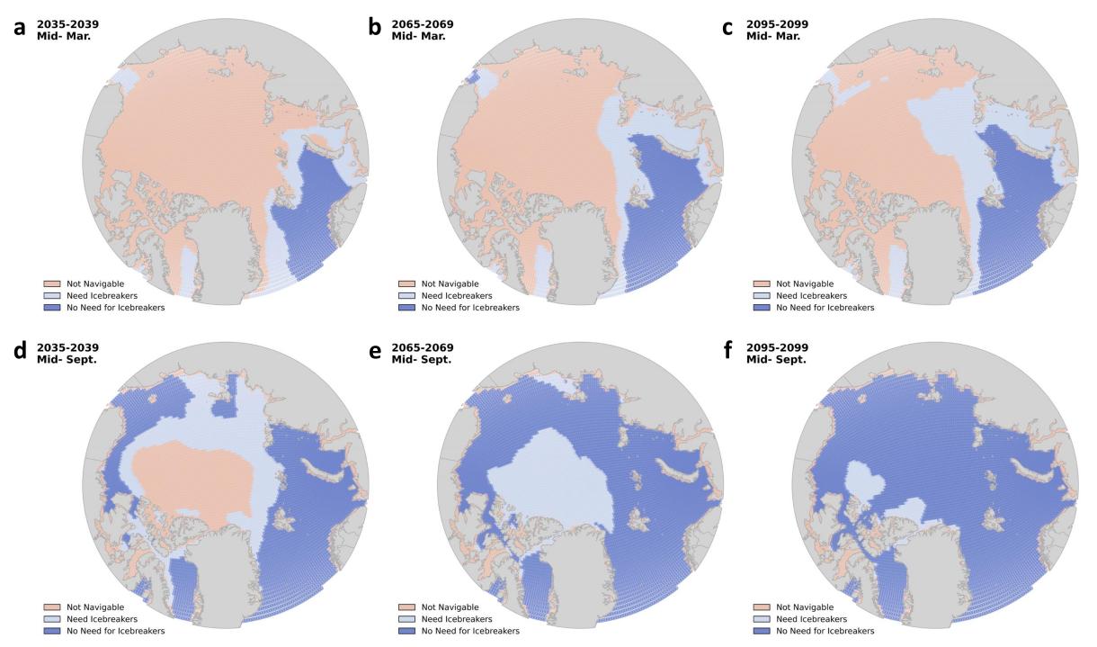 研究结果表明,在中等排放情景(SSP2-4.5)下,北极航道的通航潜力将在本世纪持续增强(图2)。2030年,年均可通航天数约为197天,到2050年增加至208天,2070年为217天,至2100年则进一步延长至247天。而在高排放情景(SSP5-8.5)下可通航天数将突破320天。北极通航条件的改善不仅体现在天数上,更体现在航道空间分布的变化。基于海冰厚度、海冰浓度和冰运动的动力学模拟结果显示在未来不同年代的春季与夏季,北极航道的可航性显著提升。尤其在9月,大片海域将从“需破冰船”转变为“不需破冰船即可通航”,显示出夏季航运环境的快速改善。这一趋势凸显了气候变化对北极海冰消退的深远影响。