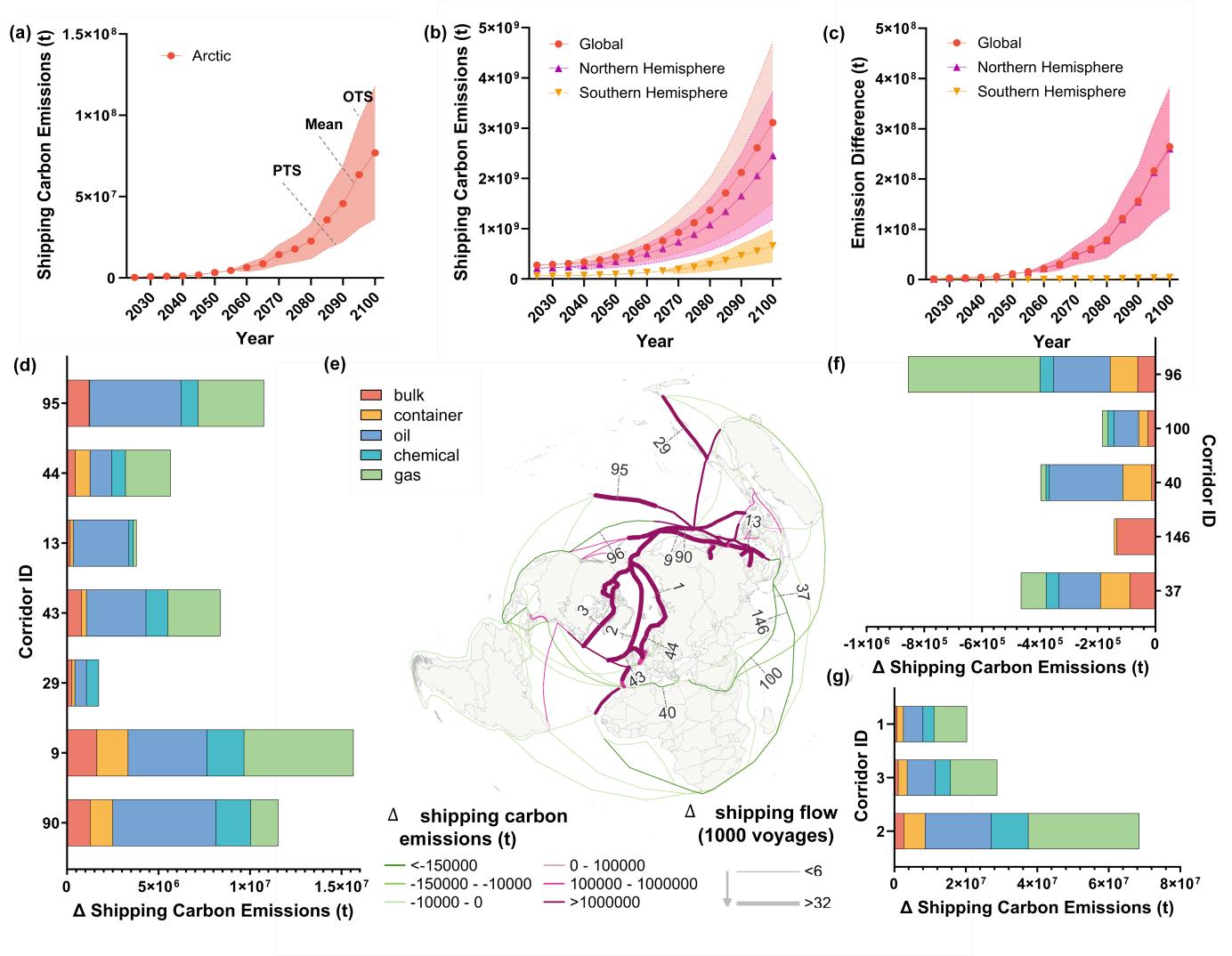 北极航道还将重塑全球航运碳排放时空分布。北极航道尽管缩短了航程、降低了单次排放,但总体交通量的激增将使北极区域碳排放到2100年跃升至全球总量的2%以上,成为全球前五大高排放通道(图4)。全球其他航运通道的碳排放的空间分布也将会随着北极航道的开通而发生变化:东北亚、北欧和北美等地区将面临更大的航运碳排放增长压力,而苏伊士运河、马六甲海峡等传统航运要道则略有缓解。整体来看,北极航道的开放不仅改变了全球航运网络,也显著加剧了碳排放的区域不均衡,对全球减排目标和环境公平提出了新的挑战。