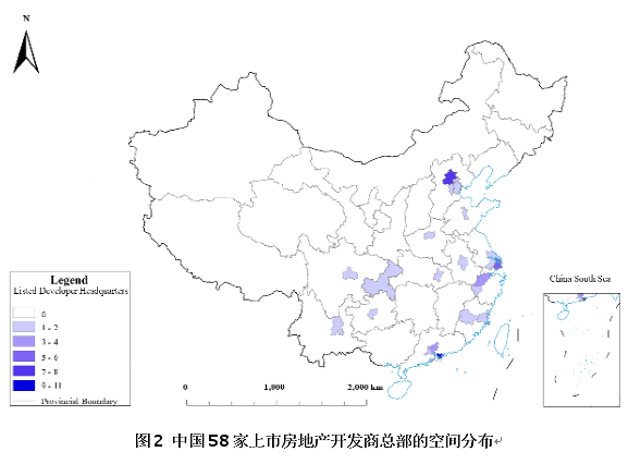 本文以开发商的土地购买规模作为被解释变量,解释变量主要包括地方市场因素、企业特征和制度变量三个维度。研究选取中国290个地级及以上城市作为考察范围,构建了一个覆盖2017—2022年的“城市—企业—年份—土地购置规模”数据库。数据主要来源于 Wind 中国土地数据库,记录了58家A股和H股上市房地产开发企业在不同城市的住宅用地购置情况(图2)。其中,制度变量是本文关注的重点,正式制度包括市场化和财政分权,非正式制度包括地方信任和政治关联。为尽量减轻反向因果问题,本文对各解释变量整体采用了一年滞后处理。此外,文章还纳入了总部与目标城市之间的地理距离、年份固定效应和区域固定效应等控制变量,以尽可能控制其他潜在影响因素。