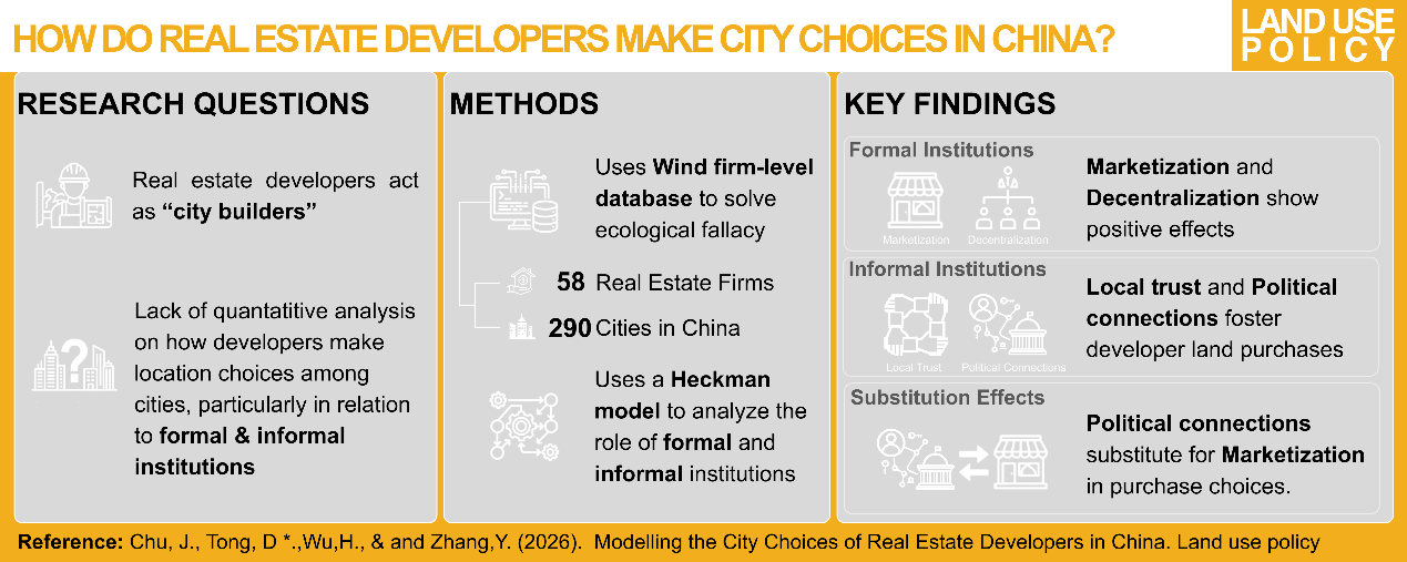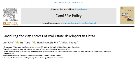 近日,香港中文大学与北京大学联合研究团队在城市与土地研究领域国际权威期刊 Land Use Policy在线发表了题为“Modelling the City Choices of Real Estate Developers in China”的最新研究成果。该文旨在深度剖析中国房地产开发商城市战略布局与发展模式的底层逻辑。