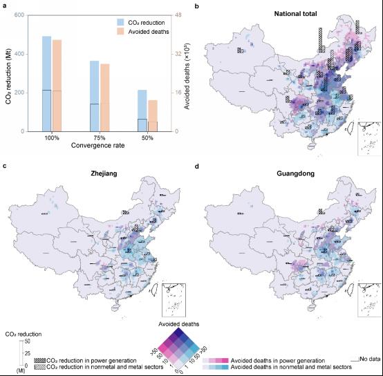 研究模拟了在供应链协同和技术扩散作用下,上游地区向下游先进地区能效水平趋同的多种情景。结果表明,在完全趋同情景下,全国贸易相关二氧化碳排放可减少约17%,同时避免约19%的PM2.5相关过早死亡。即便在仅实现50% 能耗强度趋同的现实约束情景下,仍可减少约213 Mt二氧化碳排放,并避免约1.3万人过早死亡。其中,浙江和广东两省合计贡献了约40%以上的全国协同减排潜力。