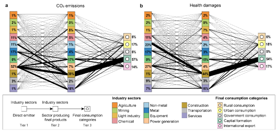 研究发现,中国91% 的二氧化碳排放和73%的PM2.5相关过早死亡与供应链经济活动直接相关,但两类环境影响在产业结构中的分布显著不同。电力部门贡献了超过一半的生产端二氧化碳排放,但其对应的健康损害不足三分之一;而非金属行业虽然碳排放占比相对较低,却贡献了接近四分之一的PM2.5相关健康损害。这一结果揭示了气候与健康目标在产业层面的系统性错配。与此同时,在供应链的最终生产和投资需求层面,二氧化碳排放与健康损害高度集中,表明通过供应链协同推进减排与能效提升,是实现气候-健康双重收益的关键突破口。