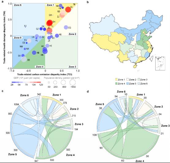 研究构建了贸易相关碳排放差异指数(TCI)和健康损害差异指数(THI),将中国省际供应链划分为六类。北京、上海、浙江和广东等最终生产枢纽省份在碳排放和健康损害两个维度上均表现为显著“净输入端”,反映出其通过供应链集中获取经济附加值,同时将环境负担外包至其他地区。17%的省际贸易相关二氧化碳排放(约530 Mt)主要来自人口稀疏的西北地区,而27%的贸易相关PM2.5过早死亡(约6.3 万例)主要来自中东部人口密集的工业省份。这种“碳与健康分离承载、共同汇聚”的格局,揭示了单纯以碳减排为导向的区域治理难以兼顾健康公平,也凸显了以最终生产部门为枢纽、通过供应链协同推进减排与能效提升的现实必要性。